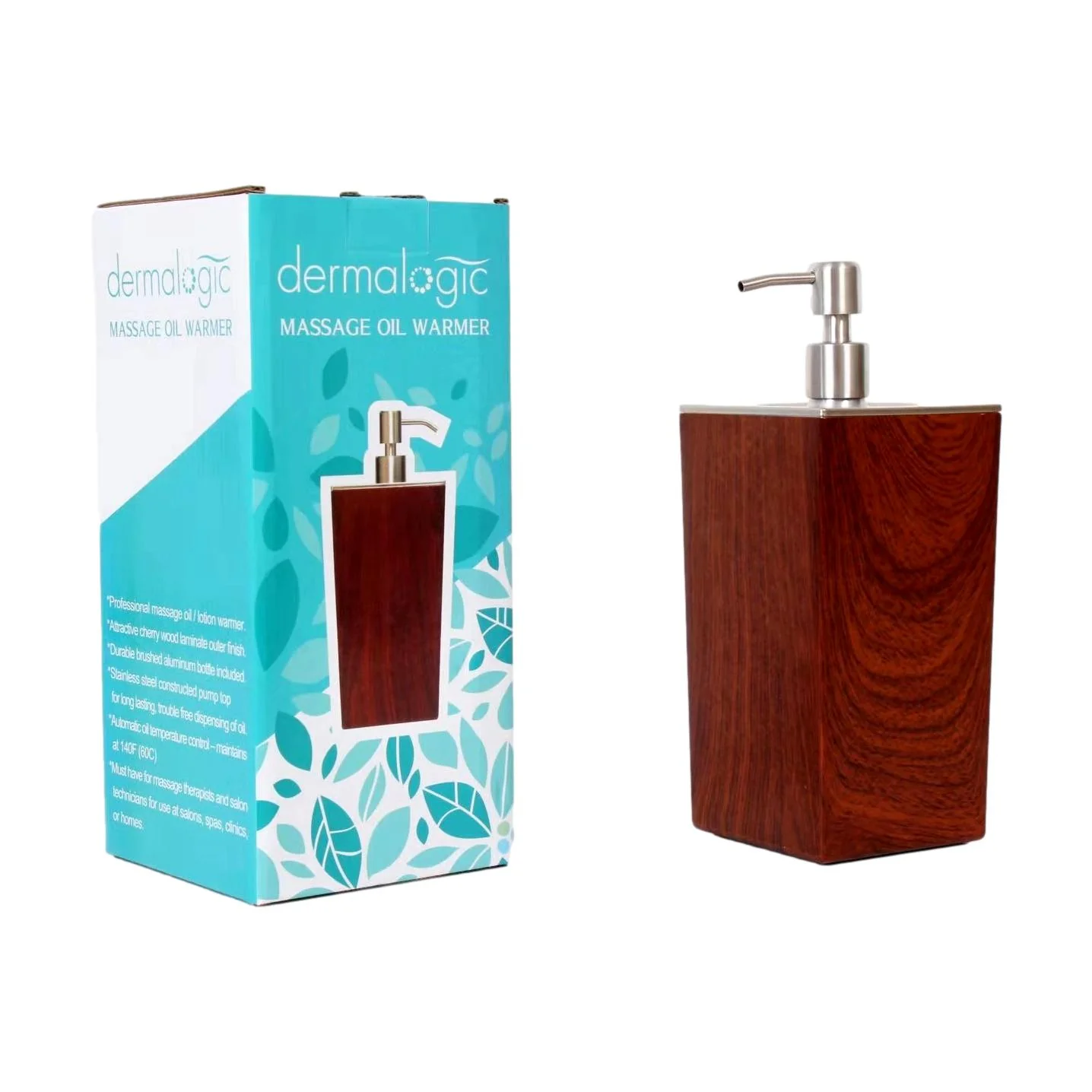 Keep your favorite massage oil or lotion at a temperature of 140F (60C). Offering an elegant, contemporary design, this warmer features a cherry wood laminate container and a brushed aluminum bottle with a stainless steel pump top. Holds 8.5 fl. oz. Â